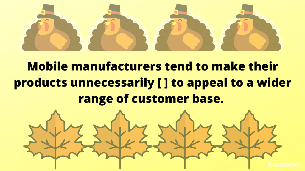 1. Mobile manufacturers tend to make their products unnecessarily [ ] to appeal to a wider range of customer base. (必須)