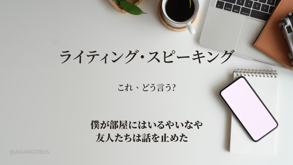 No sooner had I entered the room, my friends stopped talking. b. This isn’t right. No sooner had I entered the room than my friends stopped talking. No sooner… というのは、入るやいなや、といった、カンマで区切る副詞句ではなく、文章の前半で、 sooner があることから、予想は付くでしょうが、 than が置かれ、起こったことが続きます。 © Copyright 2022 Adamorbis, LLC. All Rights Reserved. このサイトの全てのコンテンツは、Adamorbis, LLC の知的財産であり、サイトを訪れた個人による、個人的消費に供されます。他者・公を問わず、いかなる手段によるものでも、転載・書き換え、引用等、の手段による内容の伝達は、全て禁じます。