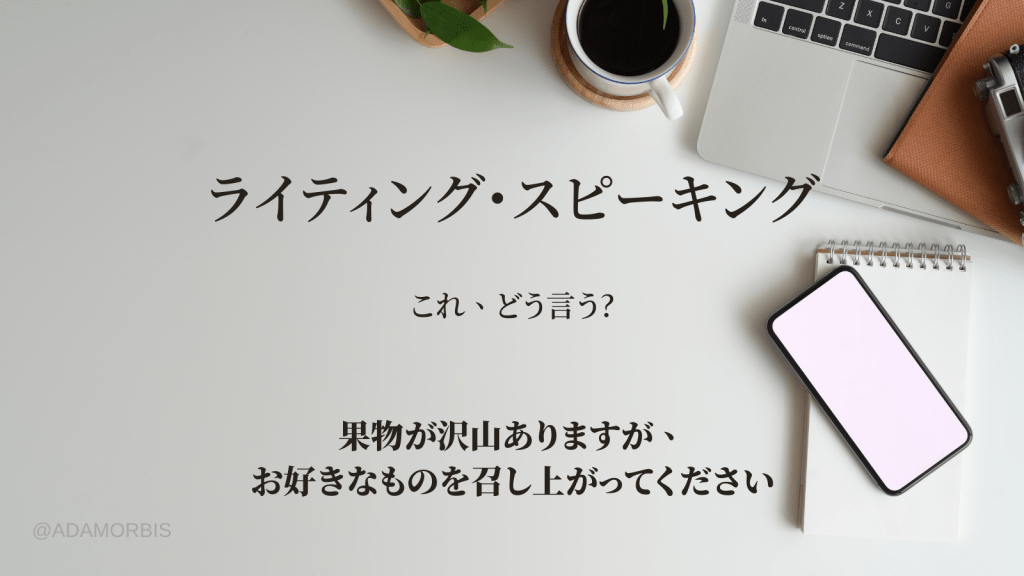 1. Although there are many fruits, please have whatever you like. b. This isn’t right. There are many fruits, so please have whatever you like. ありますが、の、が、は、逆接、 although や、 though や、 but を意味する、ありますが、食べてはいけません、といった、逆接ではありません。順接、ありますので、ありますから、でつながっています。が、とくればすぐ逆接と捉えず、和文をよく読み、順接の場合もある、ということを思い出してください。nnn© Copyright 2022 Adamorbis, LLC. All Rights Reserved. このサイトの全てのコンテンツは、Adamorbis, LLC の知的財産であり、サイトを訪れた個人による、個人的消費に供されます。他者・公を問わず、いかなる手段によるものでも、転載・書き換え、引用等、の手段による内容の伝達は、全て禁じます。