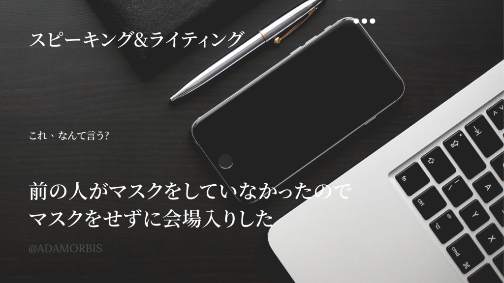 As the person in front was not wearing a mask, did the venue entry without one. b. This isn’t right. As the person in front of me was not wearing a mask, I entered the venue without one. 課題の英文には、entered の主語がありません。和文になくても、和文では省略されているだけです。なので、入れるべき主語を入れます。前の、というのは、自分の、ですので、 in front of me です。 そして、和文の、名詞 + する、の、会場入りする、は、do the venue entry と和文そのままではなく、entered the venue 会場に入る、と英語では言います。 © Copyright 2022 Adamorbis, LLC. All Rights Reserved. このサイトの全てのコンテンツは、Adamorbis, LLC の知的財産であり、サイトを訪れた個人による、個人的消費に供されます。他者・公を問わず、いかなる手段によるものでも、転載・書き換え、引用等、の手段による内容の伝達は、全て禁じます。
