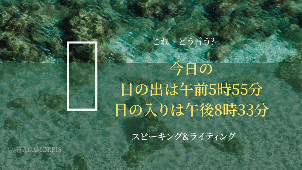Today’s sunrise time is 5:55 am and sunset time is 8:33 pm. b. This isn’t right. Today’s sunrise is at 5:55 am and sunset is at 8:33 pm. 提示の文章で、通じますが、ここで、 time と、時刻表示がマッチしていて正しいと思われるかも知れませんが、time を入れずに、 is の後に時刻を表す at が伴うのが通常です。 © Copyright 2022 Adamorbis, LLC. All Rights Reserved. このサイトの全てのコンテンツは、Adamorbis, LLC の知的財産であり、サイトを訪れた個人による、個人的消費に供されます。他者・公を問わず、いかなる手段によるものでも、転載・書き換え、引用等、の手段による内容の伝達は、全て禁じます。
