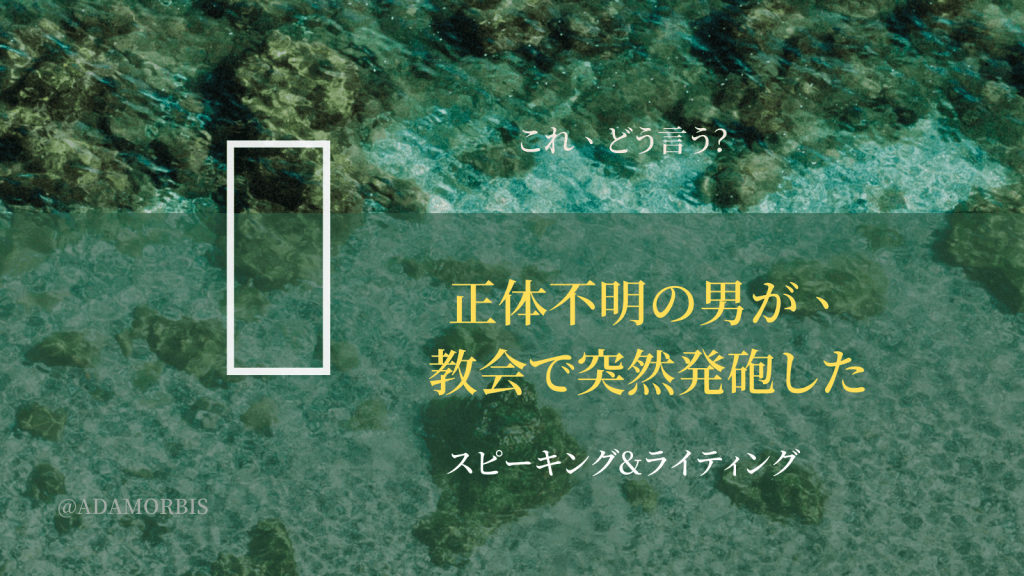 An unknown man suddenly shot a gun at a church. b. This isn’t right. An unidentified man suddenly opened fire at a church. 正体不明の、や、身元不明の、という場合は、unknown 知られていない、ではなく、 unidentified を使います。UFO つまり unidentified flying object に使う、 unidentified です。そして、 shoot a gun で銃を撃つ、ですが、発砲する、という場合は、 open fire と言います。 © Copyright 2022 Adamorbis, LLC. All Rights Reserved. このサイトの全てのコンテンツは、Adamorbis, LLC の知的財産であり、サイトを訪れた個人による、個人的消費に供されます。他者・公を問わず、いかなる手段によるものでも、転載・書き換え、引用等、の手段による内容の伝達は、全て禁じます。