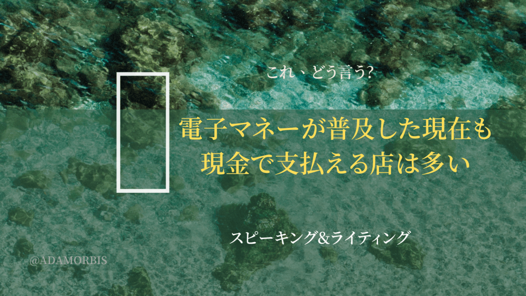 Although e-money is widely used nowadays, there are many shops that can pay in cash. b. This isn’t right. Although e-money is widely used nowadays, there are many shops that can be paid to in cash. shops that can pay ですと、店が払える、です。お金は客が店に支払うのですから、この和文には、人が払える、にある、人がという主語が省略されています。なので、店にとっては、現金で支払われる、という受動態になるべきところです。 これで、文法的に正しくなります。しかし、英語では、こうは言わず、 Although e-money is widely used nowadays, there are many shops that accept cash as payment. 現金を支払いとして、受け入れる店、というふうに表現します。和文の主語抜きにご注意を喚起しておきます。 © Copyright 2022 Adamorbis, LLC. All Rights Reserved. このサイトの全てのコンテンツは、Adamorbis, LLC の知的財産であり、サイトを訪れた個人による、個人的消費に供されます。他者・公を問わず、いかなる手段によるものでも、転載・書き換え、引用等、の手段による内容の伝達は、全て禁じます。