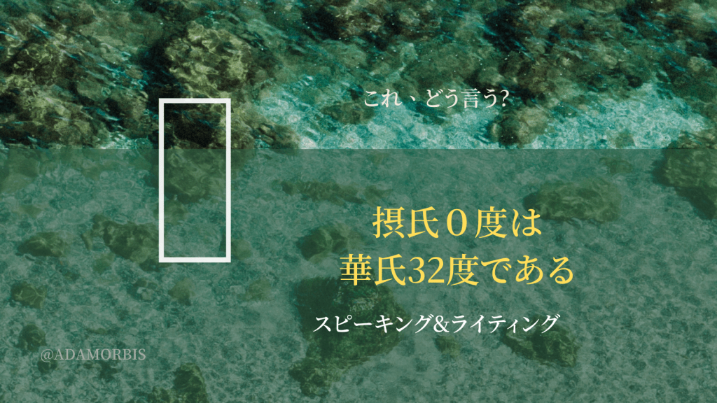 Zero degree Celsius is 32 degrees Fahrenheit. b. This isn’t right. Zero degrees Celsius is 32 degrees Fahrenheit. 最初の degree が複数 degrees であることにお気づきください。英語の単位は、ほぼすべて加算名詞で、degree も複数形にします。これは、例え 0 だったとしても、です。 degree と単数になるのは、 1 の場合だけです。 1.2 でも、 0.5 でも degrees と複数になります。書く場合も話す場合も気をつけてみましょう。 © Copyright 2022 Adamorbis, LLC. All Rights Reserved. このサイトの全てのコンテンツは、Adamorbis, LLC の知的財産であり、サイトを訪れた個人による、個人的消費に供されます。他者・公を問わず、いかなる手段によるものでも、転載・書き換え、引用等、の手段による内容の伝達は、全て禁じます。