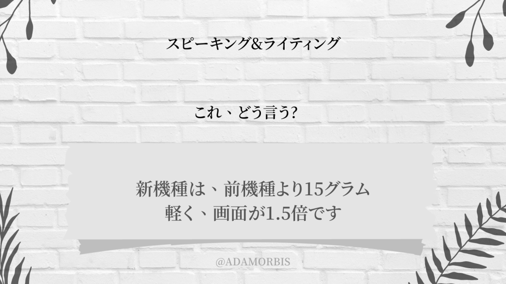 The new model is 15 grams lighter than the previous model, and its screen is 1.5 times bigger. b. This isn’t right. The new model is 15 grams lighter in weight and 1.5 times bigger in screen size than the previous model. 提示の英文で通じはするのですが、ブロークンです。 前機種より、が、15 グラム軽いの手前にありますので、どうしても、 than the previous model を、その後に置きがちですが、than 以降は、より軽く、より大きいという2つの比較のどちらにもかかりますので、後置が自然です。そのため、and でつなぐ2つの重文にすると、 than 以降が、後者にしかかからないため、重文にしてはいけません。そのため、主語を The new model にしたまま、比較級2つをならべ、それぞれ in weight 重量において、 in screen size 画面の寸法において、を加え、最後に than 以降の比較の対象を入れます。これで、形態が整い、より良く、自然になります。 © Copyright 2022 Adamorbis, LLC. All Rights Reserved. このサイトの全てのコンテンツは、Adamorbis, LLC の知的財産であり、サイトを訪れた個人による、個人的消費に供されます。他者・公を問わず、いかなる手段によるものでも、転載・書き換え、引用等、の手段による内容の伝達は、全て禁じます。