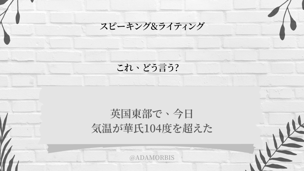 The temperature today rose higher than 104°F in eastern England. a. This is correct. The temperature today topped 104°F in eastern England. 提示した英文で間違いはありませんが、 rose higher than ~より高く上昇した、という rose は、和文にはありません。超えた、は、 top という動詞で言い表せ、非常によく使われ、かつ、短く便利ですので、使われてはいかがでしょうか。華氏104度、は、摂氏40度、です。 © Copyright 2022 Adamorbis, LLC. All Rights Reserved. このサイトの全てのコンテンツは、Adamorbis, LLC の知的財産であり、サイトを訪れた個人による、個人的消費に供されます。他者・公を問わず、いかなる手段によるものでも、転載・書き換え、引用等、の手段による内容の伝達は、全て禁じます。