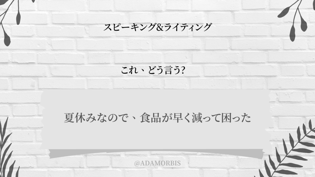 The groceries were eaten quickly because it was the summer recess. b. This isn’t correct! The food was eaten quickly because it was the summer recess. groceries/grocery というのは、買うものです。eat するのは、 food です。買ったものが groceries でも、食べる段になると、 food です。 nnn© Copyright 2022 Adamorbis, LLC. All Rights Reserved. このサイトの全てのコンテンツは、Adamorbis, LLC の知的財産であり、サイトを訪れた個人による、個人的消費に供されます。他者・公を問わず、いかなる手段によるものでも、転載・書き換え、引用等、の手段による内容の伝達は、全て禁じます。
