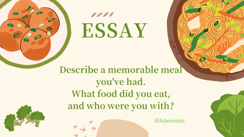 今回は、エッセイの課題です。画像には、Describe a memorable meal you’ve had. What food did you eat, and who were you with? までしか書いていませんが、これに、 How did the experience make you feel? が続きます。エッセイを書いてみませんか。全部に答えなくてもいいですよ。