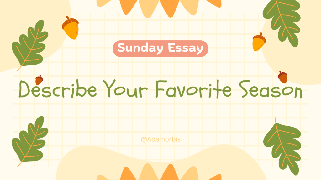 書き方: In this essay, you will describe your favorite season. You can choose from spring, summer, fall, or winter. Use simple sentences and vocabulary to express why you like this season. Include information about the weather, activities, and things you can see during this season. Try to write at least three sentences about your favorite season.